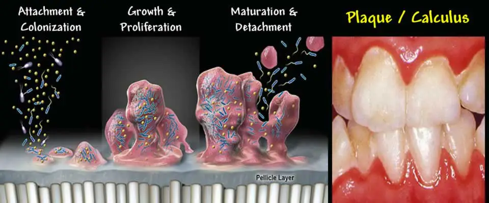The human mouth is a hotbed for bacterial activity and whenever we eat, food debris that is not cleansed away can combine with bacteria and natural mineral salts to form plaque, a soft, initially transparent layer of biofilm that sticks to teeth. This biofilm layer then grows in density and eventually becomes ‘mature plaque’ which is soft and whitish in appearance. Finally, if this is not cleaned away, it evolves to become calculus (a.k.a. tartar) that is extremely hard, often colored in appearance, and sticks to teeth extremely tightly. Once calculus forms, it normally cannot be removed by patients alone and would require a professional cleaning.